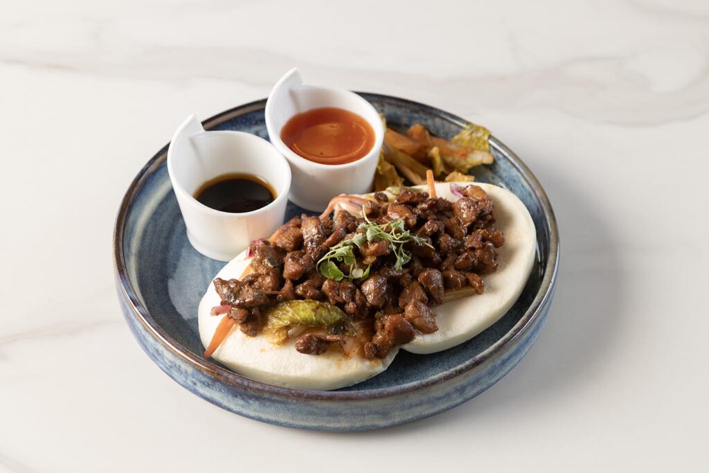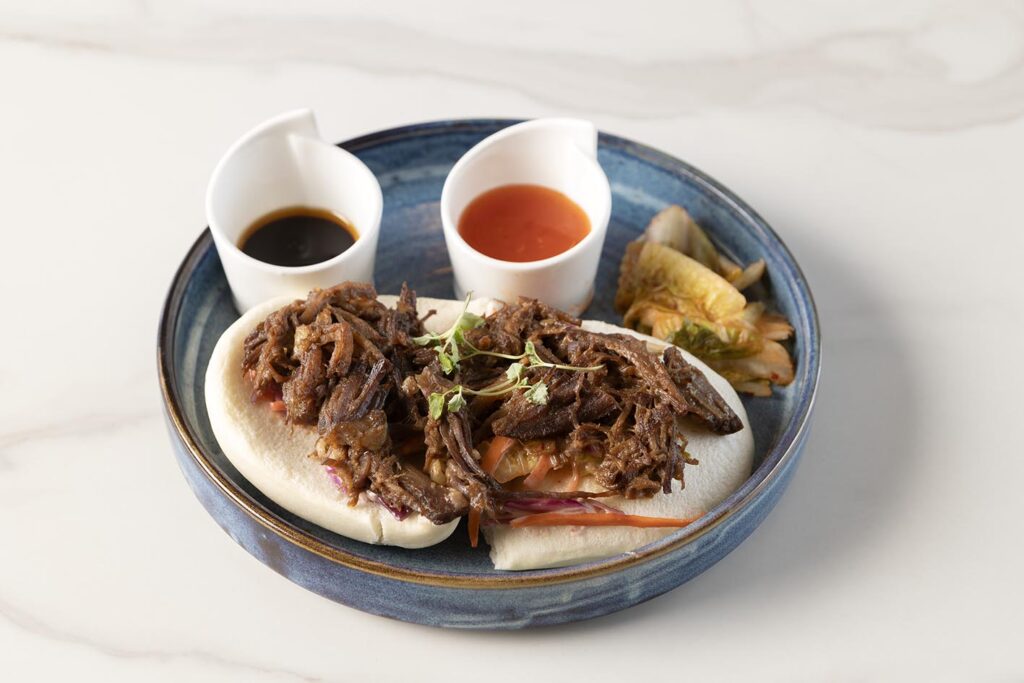 Pulled ribs, hoisin sauce served with sweet chilli and dumpling sauce & kimchi