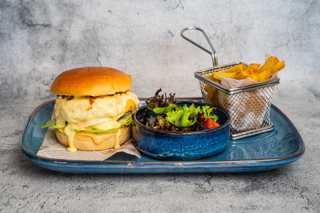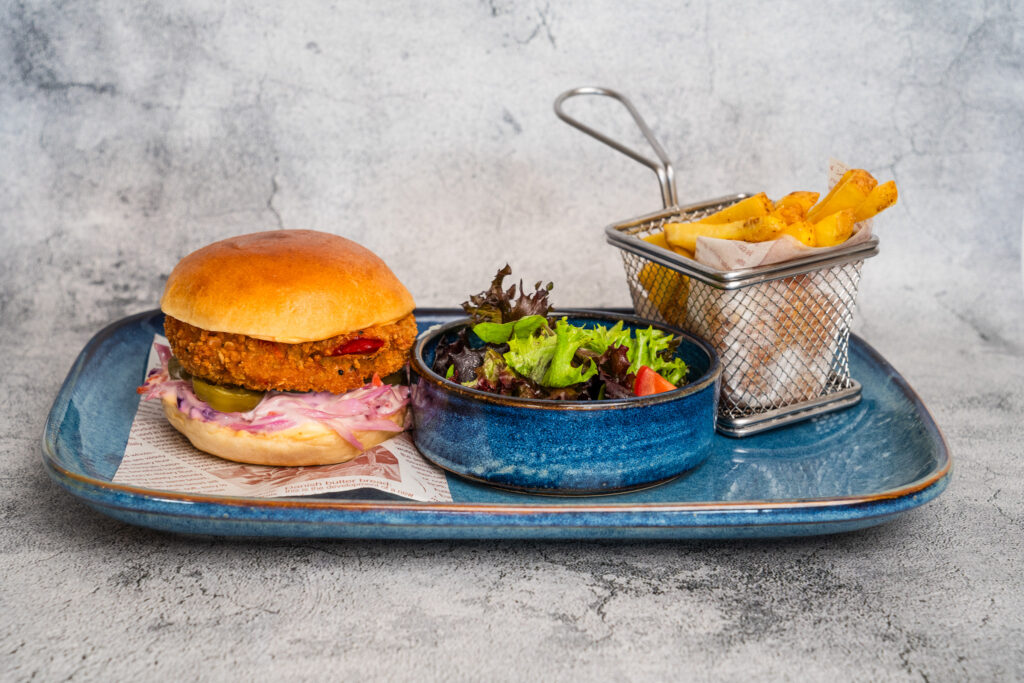 Grilled chicken & herb patty, gochujang mayo, iceberg lettuce, brioche bun, fries