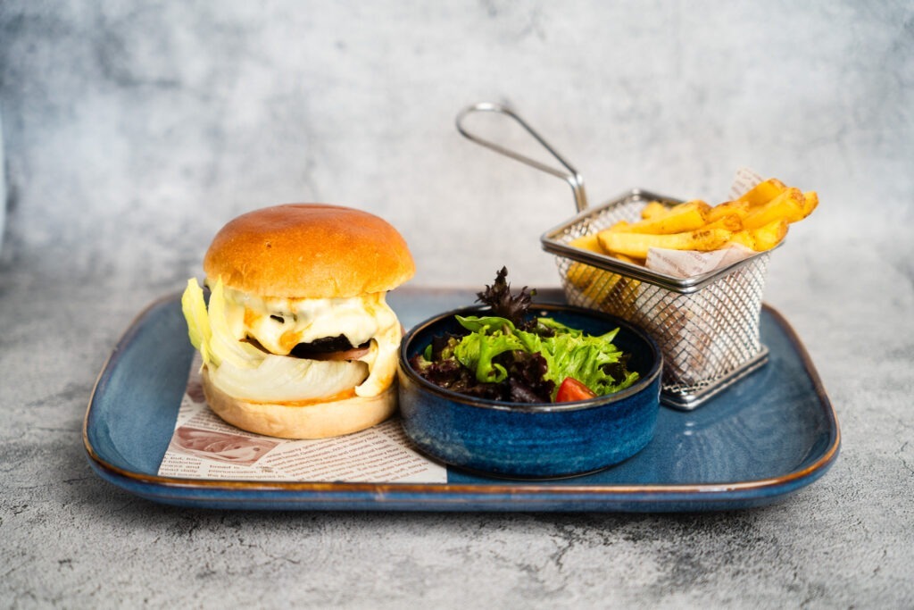 Double beef patty and cheese, animal sauce, brioche bun, fries
