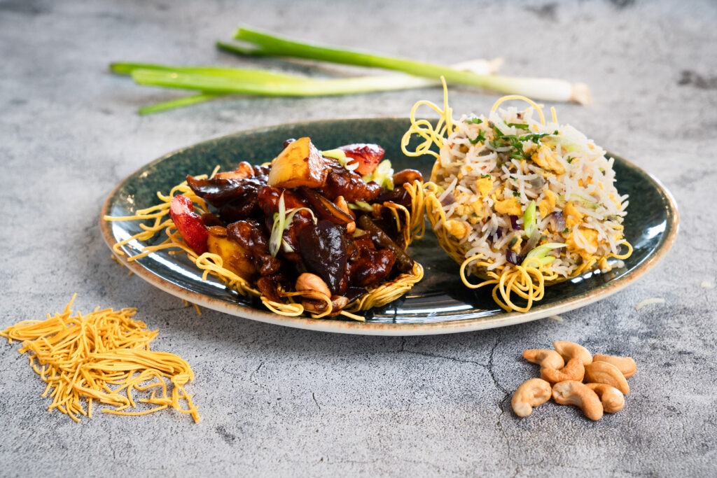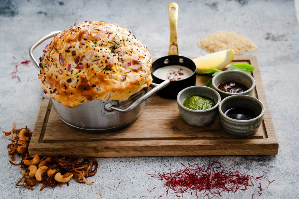 Slow-cooked melange of aromatic basmati rice, chicken, caramelised onions, cashew nuts, raisins and spices, scented with saffron, mint and clarified butter, layered in an earthenware pot, sealed and baked with bread dough. The bread is cut open to serve the biryani, releasing the spice aromas. Served with sumac yoghurt.