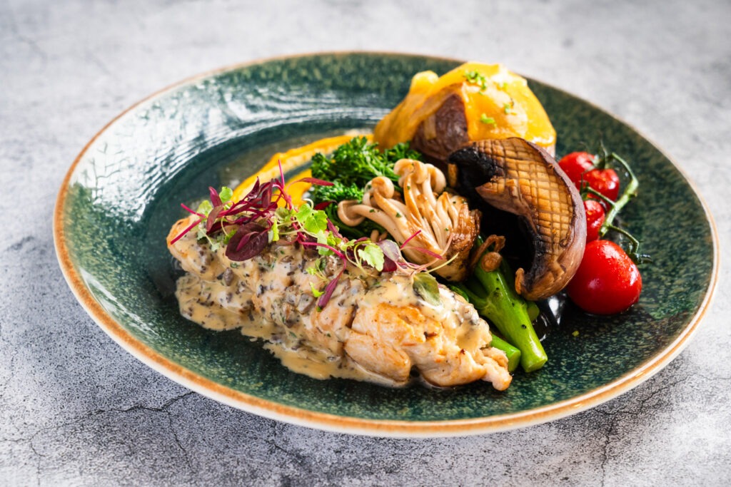 Chicken supreme filled with minced chicken and cream cheese, mushroom sauce, jacket potato